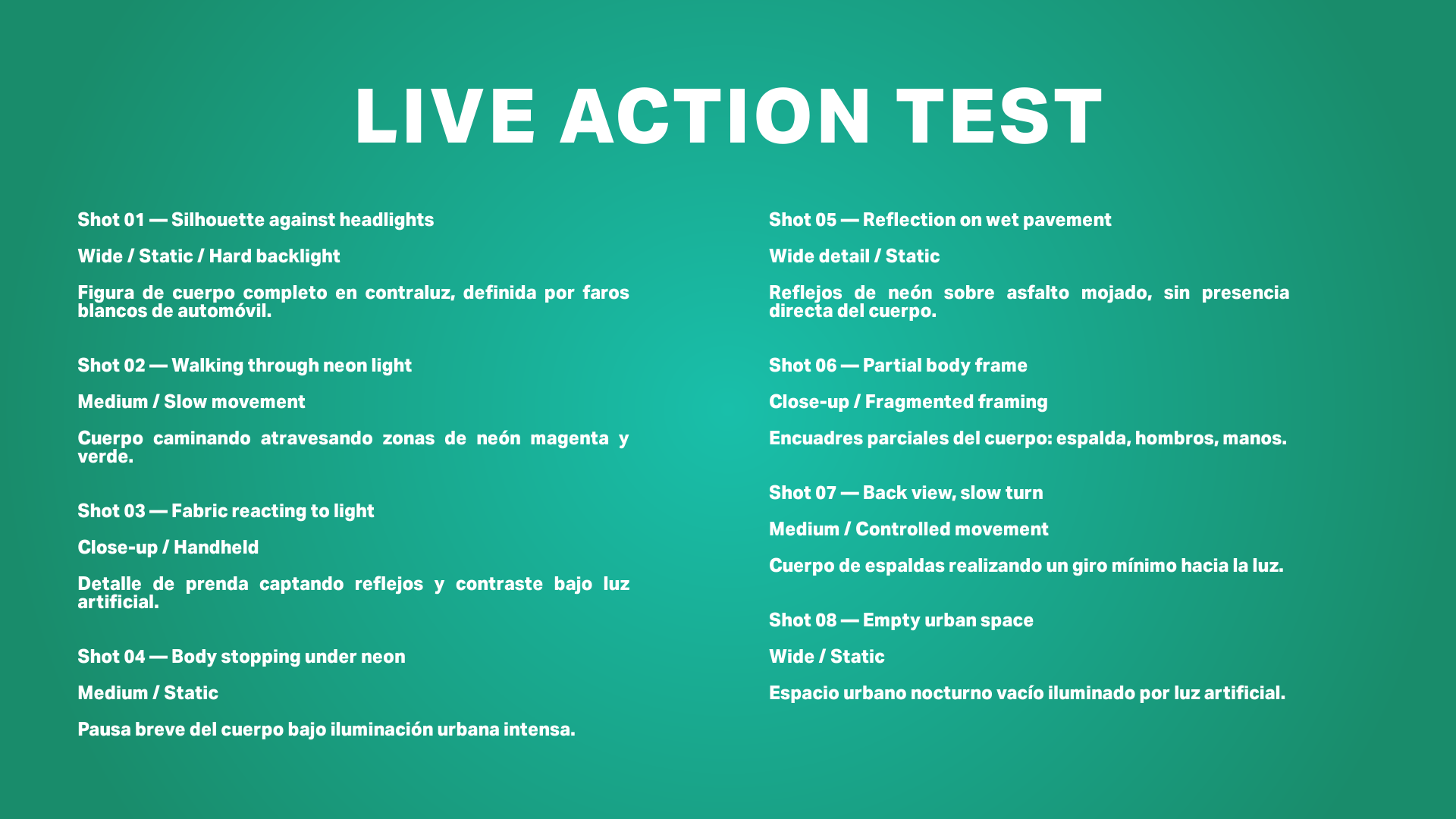 El proyecto se construye desde una aproximación cinematográfica, priorizando la imagen en movimiento, el ritmo y la relación entre cuerpo, luz y entorno artificial.