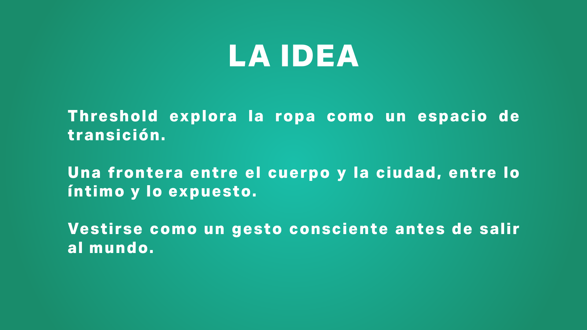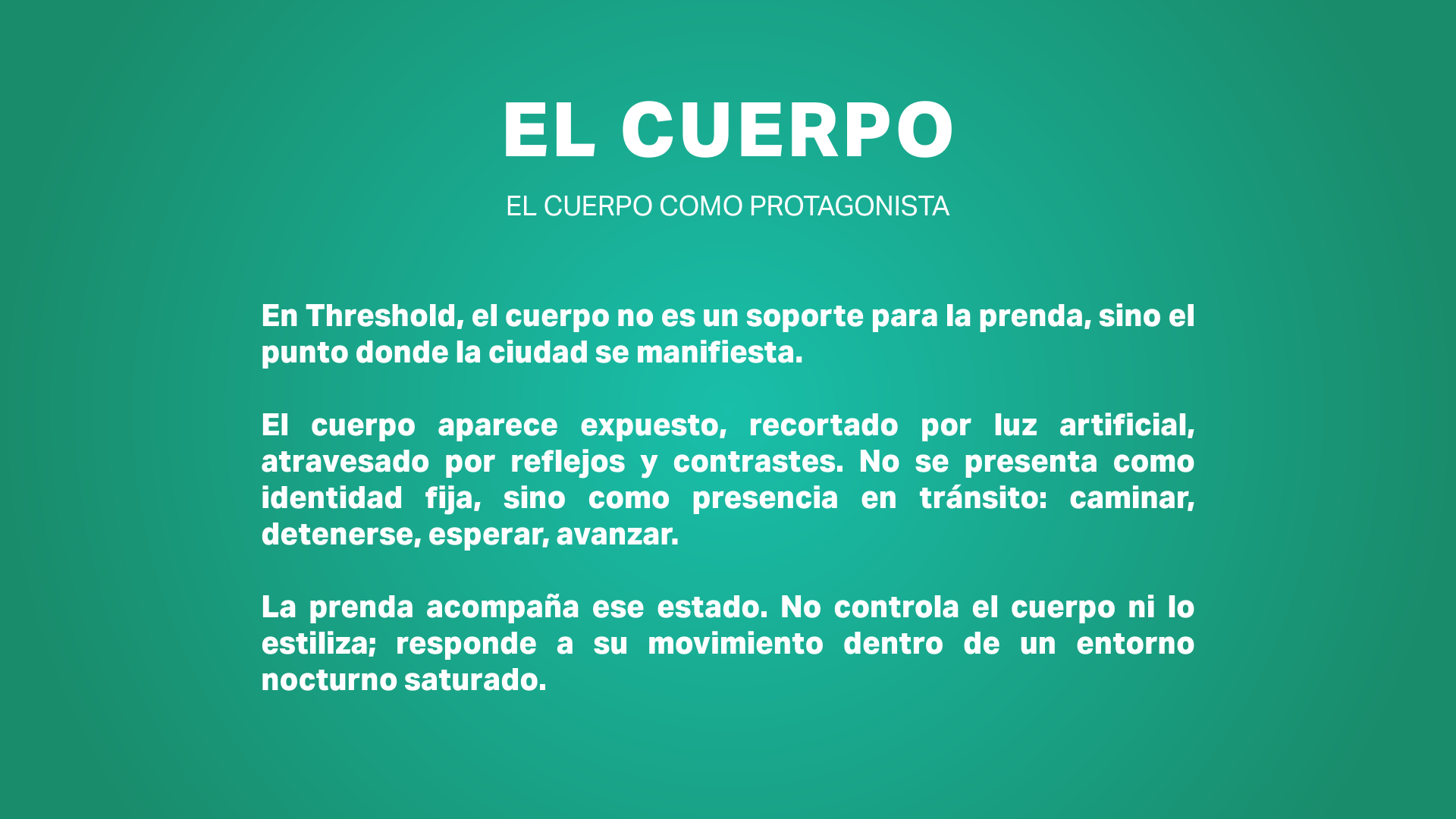 Threshold es un proyecto especulativo que explora la ropa como un umbral dentro del entorno urbano nocturno. Un espacio de fricción entre el cuerpo y una ciudad atravesada por luz artificial, movimiento y exposición constante.